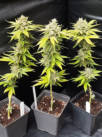 Na nog twee weken in de groeistand en wat toegepaste training gingen ze naar het lichtschema 12/12. Met een korte bloeitijd van 7 tot 8 weken waren ze ook precies na 7,5 week oogstklaar. Een plant met Kush-achtige toppen die een zoete aardbeiengeur hebben. Bij het roken proef je een lekkere gassy diesel smaak. Om te verduisteren of voor een binnenkweek is dit een aanrader, en te verkrijgen op Sirius.nl. Omdat ik hem zo bijzonder vond, heb ik de topjes van de twee onderste zijtakken bestoven met pollen van een mannelijke Sweets van Karma Genetics. Hiervoor had ik de meest potente pheno uitgekozen. Dit leverde weer mooie zaden op voor een nieuw experiment.