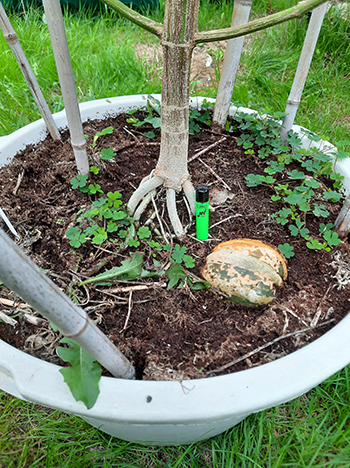 Eind mei had ik deze van een 2-literpot in een 18-literpot gezet. Hier hebben ze nog lekker een maandje in kunnen wortelen, en eind mei zijn ze verhuisd naar een 65-literkuip. Bij elke keer verpotten heb ik ze iets hoger in de nieuwe pot gezet om zo een verhoogd bed te maken.