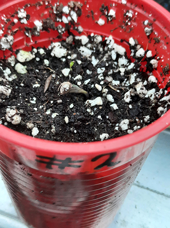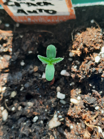 De SeedStockers zaden voor de CNNBS buitenwiet-test liet ik op 2 mei ontkiemen. Na vijf dagen was er al een teken van leven te zien en in alle potjes popte er al iets uit de grond. De zaadschilletjes barstten open en de lob-blaadjes kwamen tevoorschijn. Behalve bij nr. 3, Dynamite Kiks. Al snel stopte haar groei en het schilletje is nooit opengebarsten, na anderhalve week heb ik haar maar opgegegeven, helaas.