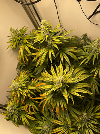 Ik denk dan ook niet dat de vergeling tussen de nerven van de bladeren te maken heeft met een direct tekort aan magnesium, zink, ijzer of een ander sporenelement. Wel is het de afgelopen weken ontzettend warm geweest, waardoor het in een kweekkast gemakkelijk 37 graden of zelfs nog warmer kan worden. Mijn vermoeden is dan ook dat je vrouw last heeft van hittestress, en daardoor waarschijnlijk ook last heeft van lichtstress.