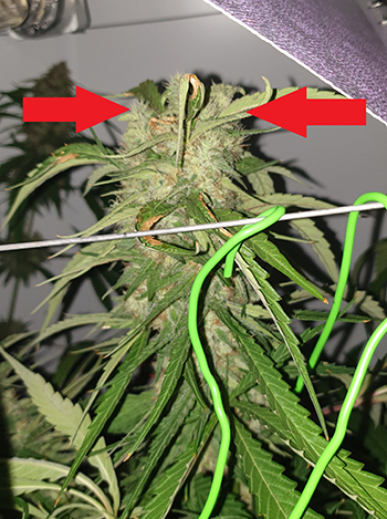 Over trichomen gesproken; die heb ik deze week ook weer even bekeken. Op de linkerfoto hieronder is het suikerblad van top 1 te zien; de meeste kristallen zijn al wit geworden. Op de rechterfoto is een suikerblad van top 2 te zien. Ook hier zijn veel witte trichomen te zien.