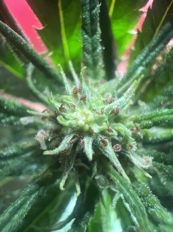 Eén mannelijk bloempje heeft duizenden stuifmeelkorrels, dus er zijn er niet veel nodig om een hele tent vol te bevruchten. Zeker niet als het stuifmeel door een mooie circulatiefan door de hele tent geblazen wordt.