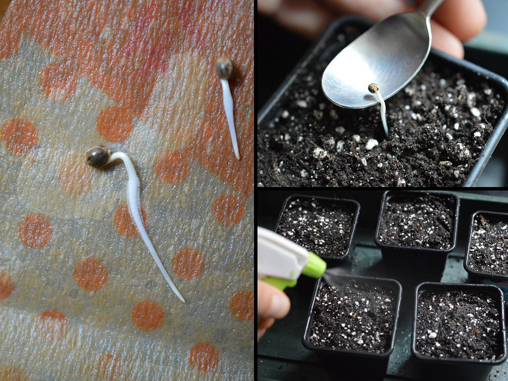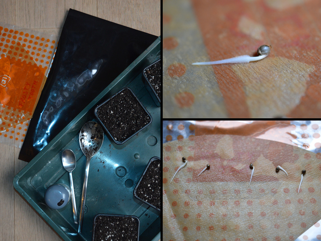 De uitgekomen zaadjes hadden alle vijf een mooi worteltje, van een perfecte lengte om meteen in de aarde te poten. Daar moet je niet te lang mee wachten namelijk. Op de foto’s kun je ook mooi zien dat de zaadjes die met hun puntje omlaag zaten, kaarsrecht naar beneden gegroeid zijn.