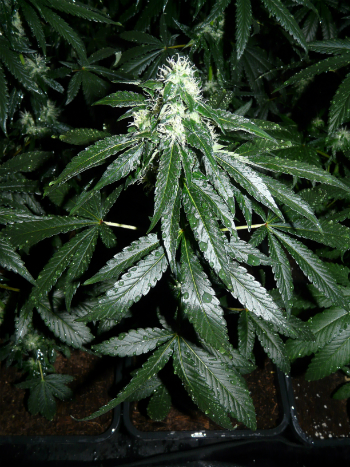 De douchebeurten zorgen ook voor een toename van de luchtvochtigheid in mijn kweekruimte, dit is heel goed in de groeifase, maar minder goed in de bloeifase. In de bloeifase wil je juist dat de luchtvochtigheid zo laag mogelijk is. Niet alleen om toprot en andere schimmels te voorkomen, maar ook omdat harsproductie (THC) beter gaat bij een droge lucht. De hars beschermt in de natuur de zaden tegen uitdroging. Hoe droger de lucht dus is, hoe meer hars de wietplanten in de bloeifase zullen aanmaken. Dit werkt, ondanks dat de planten niet bevrucht zijn en dus helemaal geen zaden dragen. Mijn planten hebben in deze vijfde bloeiweek al behoorlijke toppen gekregen, en de trichoom- of harsproductie is ook in volle gang. Daarom heb ik de dames deze week hun laatste douchebeurt gegeven.