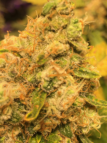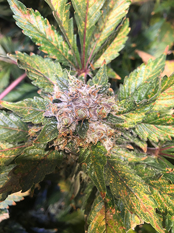 Een week geleden waren de toppen nog lekker aan het aandikken, en waren de trichomen nog helder van kleur. Deze week begint er echter wat kleur te verschijnen zoals je ziet in onderstaande close-up. Ook beginnen de bladeren erg te verkleuren en te verdorren. Dat betekent dat de plant bijna klaar is.