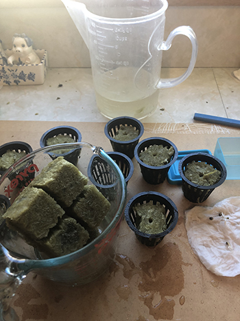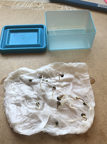 Twee plantjes zagen er wat minder happy uit. Deze heb ik eruit gehaald en nieuw zaad voor ontkiemd. De zaden ontkiemden wel allemaal supersnel met een slagingspercentage van 100%. Dit is hoe ze ontkiemden, en er drie weken na het zaaien bij staan.