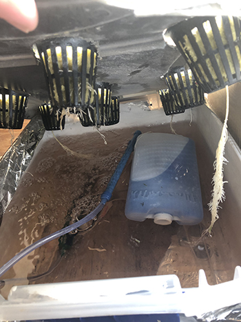 Omdat de planten bijna klaar zijn neemt ook de behoefte aan voeding af. Hierdoor heb ik ook wat verkleuring aan het blad opgelopen. De EC-waarde zit op de max van 1,6. Vanaf vandaag wordt er afgevuld met kraanwater en kan het spoelen langzaamaan beginnen. De pH-waarde zit op 5,6 vandaag, en de toppen zien er al zeer smakelijk uit!