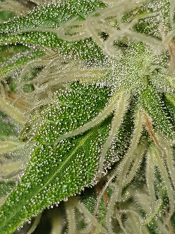 De vier Sneeze planten staan er letterlijk schitterend bij in de G-kit XL. De dames staan vol in bloei en ruiken héérlijk! De dames zijn inmiddels ook gestopt met het groeien in de hoogte, en richten zich nu vol op de ontwikkeling van hun toppen. En als we die toppen even van wat dichterbij bekijken, dan zien we dat ze goed bedekt zijn met trichomen. Ze zijn ook erg kleverig en na het aanraken komt er een nóg intensere geur vrij.