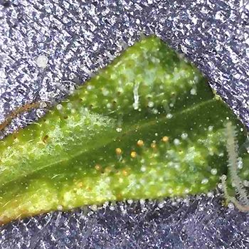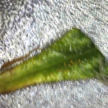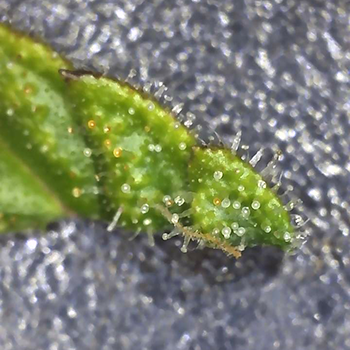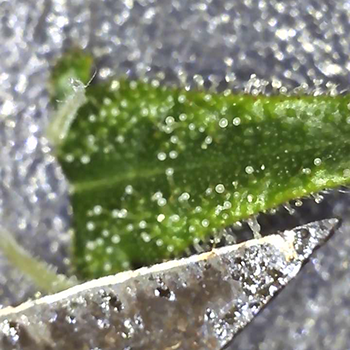 Na het afstoffen van mijn microscoop heb ik een paar suikerblaadjes afgeknipt van verschillende toppen bij de twee planten. Tot mijn verbazing waren er al amberkleurige trichomen te zien. Deze zaten alleen op de Sneeze die aan de rechterkant van de kweekkast staat, en had ik niet verwacht aangezien de dames pas in de vijfde week van de bloei zitten (die tussen de 9 en 10 weken zou moeten duren). Ik had ze pas in begin van de achtste week van de bloei verwacht.