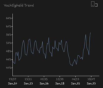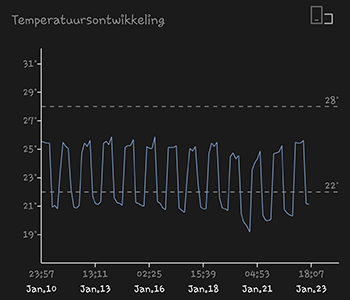 Ofwel de klimaatcijfers van de afgelopen twee weken, hier komen ze. De 315 Watt CMH lamp hangt op een hoogte van 25 centimeter boven de toppen. De gemiddelde temperatuur was de afgelopen 14 dagen 22,69 graden Celsius. De gemiddelde luchtvochtigheid was 53,38 procent. De bewatering van de dames doe ik dagelijks en dan geef ik ze gemiddeld 500 milliliter water met voeding van Plagron.