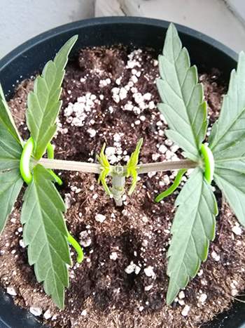 Week 3: Ze zien er behoorlijk gezond uit. Ik werk aan de vierde node. Wanneer de vijfde node verschijnt gaan er koppen rollen. Ik weet niet goed wat te doen met CNNBS Indica #4, het lijkt of ze zichzelf heeft getopt. Waarschijnlijk niets zorgwekkends. Dag 18: Indica #2 en #3 getopt voor mainlining. Dag 19: Indica #5 en #1 getopt voor mainlining. Nummer #4 laat ik voorlopig even. Dag 20: Na een dag herstel beginnen de dames weer te groeien. Dag 21: geduld…
