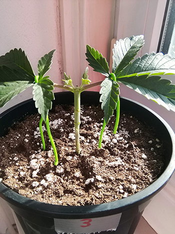 Week #1: Alle vijf de zaden ontkiemden binnen 2, 3 dagen. Nummer 3 was het snelst, nummer 5 het traagst. Ik gebruik Biobizz aarde en ben niet van plan om ze daarnaast nog voeding te geven. Dit zijn de eerste fotoperiode gevoelige wietplanten die ik kweek, dus ik weet nog niet wanneer ik ze op 12/12 zal zetten. Ik wil de planten laag houden, dus zal ze toppen en trainen.