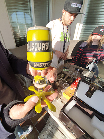 - Uncle Stoner showt de beker voor zijn Squash Off rosin pers competitie. Een handgeblazen kunstwerk van glas.