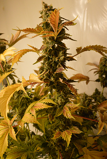 14 december: Vandaag heb ik het plantje onder de LED balkjes van G-Tools omgelegd. Mijn oog had een plekje rot ontdekt. Vreemd met die lage luchtvochtigheid van de laatste weken. Zou het niet kunnen dat de toppen zo compact zijn, dat ze van binnenuit gaan zweten en daardoor gaan rotten? Maar goed het was gelukkig maar één top, dus veel paniek heb ik dan ook niet. Het plantje hangt te drogen; nog drie te gaan maar ik hoop dat die wel nog wat dikker worden.