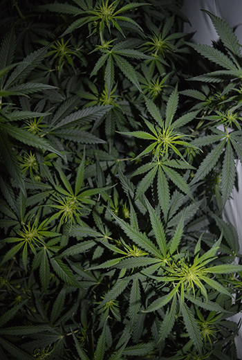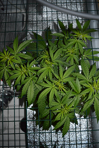 De twee planten waarvan ik de zaden als laatste ontkiemde zijn natuurlijk wel een stuk kleiner. Toch heb ik de klok op 30 november gewoon op 12/12 gezet, met de lampen gedimd tot 300 Watt per lamp. De twee grootste planten zijn al behoorlijke struiken. Een plant heeft het scrogrek bijna vol, en groeit met vier hoofdtakken vanaf de stam. Wietplant nummero twee (een kleintje) is nog voor het ingaan van de bloei getopt. Dame nummer drie wordt ook al een grote struik, en heeft slechts twee hoofdtakken. De vierde plant is ook een kleintje en is zonder training of toppen gewoon gegroeid zoals ze groeide. Deze hoef ik alleen op te binden.