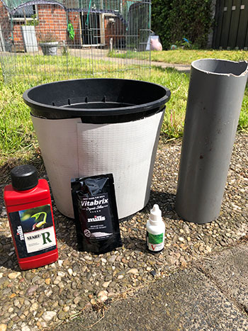 De potten water ik in met 1,5 liter water met 1 milliliter Mills Start-R. Start-R is een wortelstimulator. Ik doe als eerste een laagje aarde in de pot waar ik vervolgens een PVC-buis in het midden op zet. Na deze eerste laag doe ik meteen een laagje water over de aarde en daar een schepje Mills Vitabricks overheen. Vitabricks is een organische silicium toevoeging die de planten vrij kunnen opnemen als ze daar behoefte aan hebben.