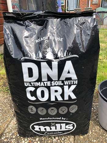 De pot heb ik aan de buitenkant beplakt met een warmte werende kunststof dakbedekking. Zo worden de potten in de zon niet zo heet en verbranden de wortels niet. Ik gebruik buiten altijd de Ultimate Soil van DNA en Mills. Deze aarde bevat korrels die bij elke waterbeurt een beetje voeding afstaan. Dit alles maakt het buitenwietseizoen heel makkelijk. Ik hoef bijna niks bij te voeren en kan simpelweg water geven en klaar is Kees.