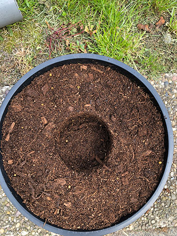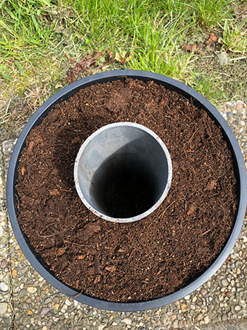 Vervolgens vul ik de pot laag voor laag om de PVC-buis heen. Na elke laag aarde doe ik de aarde weer nat maken en weer een laagje aarde. Op deze manier weet ik zeker dat de aarde op elk niveau vochtig is en staat een vlotte groei de dames niet in de weg. Wanneer de pot helemaal vol is, vul ik de PVC-buis met een Lightmix of kokos. In ieder geval iets wat weinig tot geen voeding bevat. Zo kan de penwortel van de zaailingen zonder al te veel voeding tegen te komen naar beneden groeien.