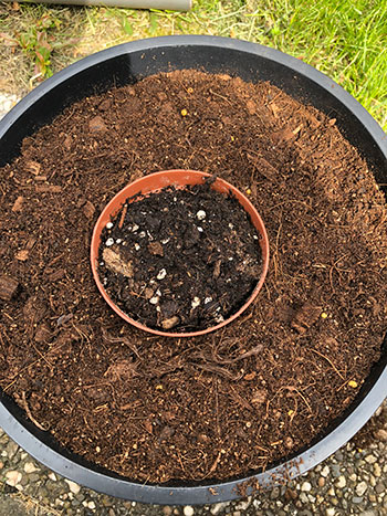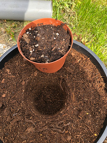 Als de pvc pijp vol is dat trek ik deze er voorzichtig uit, en ben ik klaar voor de transplantatie. Ik graaf een kuiltje waar het kleine potje met de zaailing precies in past. Vervolgens laat ik de kluit ondersteboven op mijn hand uit het potje glijden. En die past dan weer perfect in het eerder gemaakte gat, easy does it.