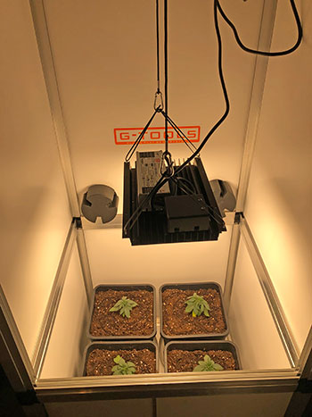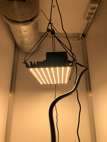 En dat is …tromgeroffel… een 120 Watt Samsung Quantum Board (3500k + 48 x 660 nm). De 660nm zijn rode diodes die de bloei stimuleren. Deze led is gesponsord door Greensell Zwolle en bevat zeer efficiënte LED chips. De Lm301b chips zijn zo ongeveer de meest efficiënte chips op de markt vandaag. Het wattage is wat aan de lage kant voor wat ik gewend ben maar het ziet er allemaal goed uit in de kast. Ik denk dat het helemaal goed komt.