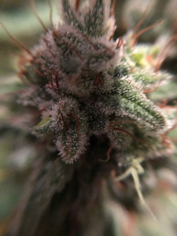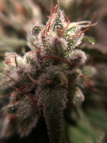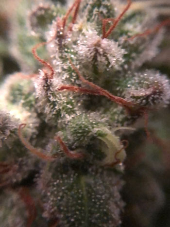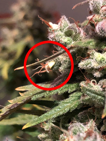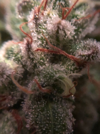Een paar dagen voor de geplande oogstsessie, zag ik met het blote oog een paar vreemde plekjes op één van de toppen. Bij nadere inspectie bleken dat mannelijke bloemetjes te zijn. Oftewel een hermafrodiet trekje, en in de volksmond zogenoemde ‘banaantjes’. Gelukkig voor mij zijn deze banaantjes in de laatste week pas ontstaan, en vormen ze dus geen gevaar voor de rest van de toppen.