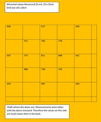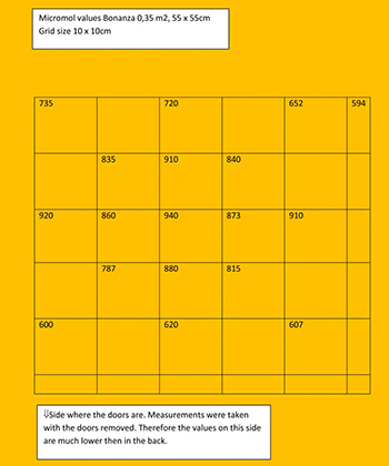 Het verbruikswattage van een kweeklamp kan je een hoop vertellen. Niet alleen op hoeveel grammen droge wiet je aan het einde van je kweek mag rekenen maar ook hoeveel ruimte de lamp nodig heeft. Veel fabrikanten van LED kweeklampen tonen je dan ook een zogenaamde PPFD kaart. Op zo’n kaart zie je het oppervlak dat de lamp belicht op een bepaalde hoogte, met de hoeveelheid licht in micromol per Joule (µmol/J) op verschillende plekken op dat oppervlak.