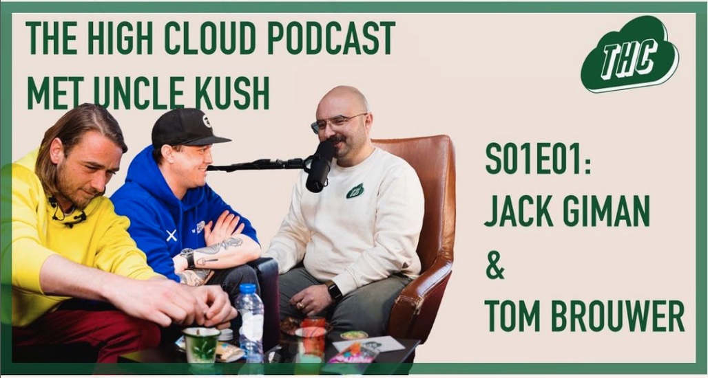 De nieuwbakken podcast host ontvangt in ons eigen hoofdkantoor in Haarlem – dat voor de gelegenheid werd omgetoverd tot een studio annex THC-sauna – cannabisondernemer Jack Giman & wietbeursveteraan Tom Brouwer.