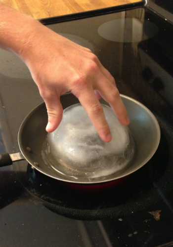 Om de delen van de hals aan elkaar te laten vriezen, smelt je de aan elkaar te zetten delen even op de bodem van een koekepan op een laag vuurtje zodat ze perfect plat zijn. Vervolgens druk je ze snel tegen elkaar terwijl ze nog nat zijn. Hou even vast tot ze samensmelten en zet ze meteen terug in de vriezer. Nu is het tijd om de basis op dezelfde manier in elkaar te zetten.