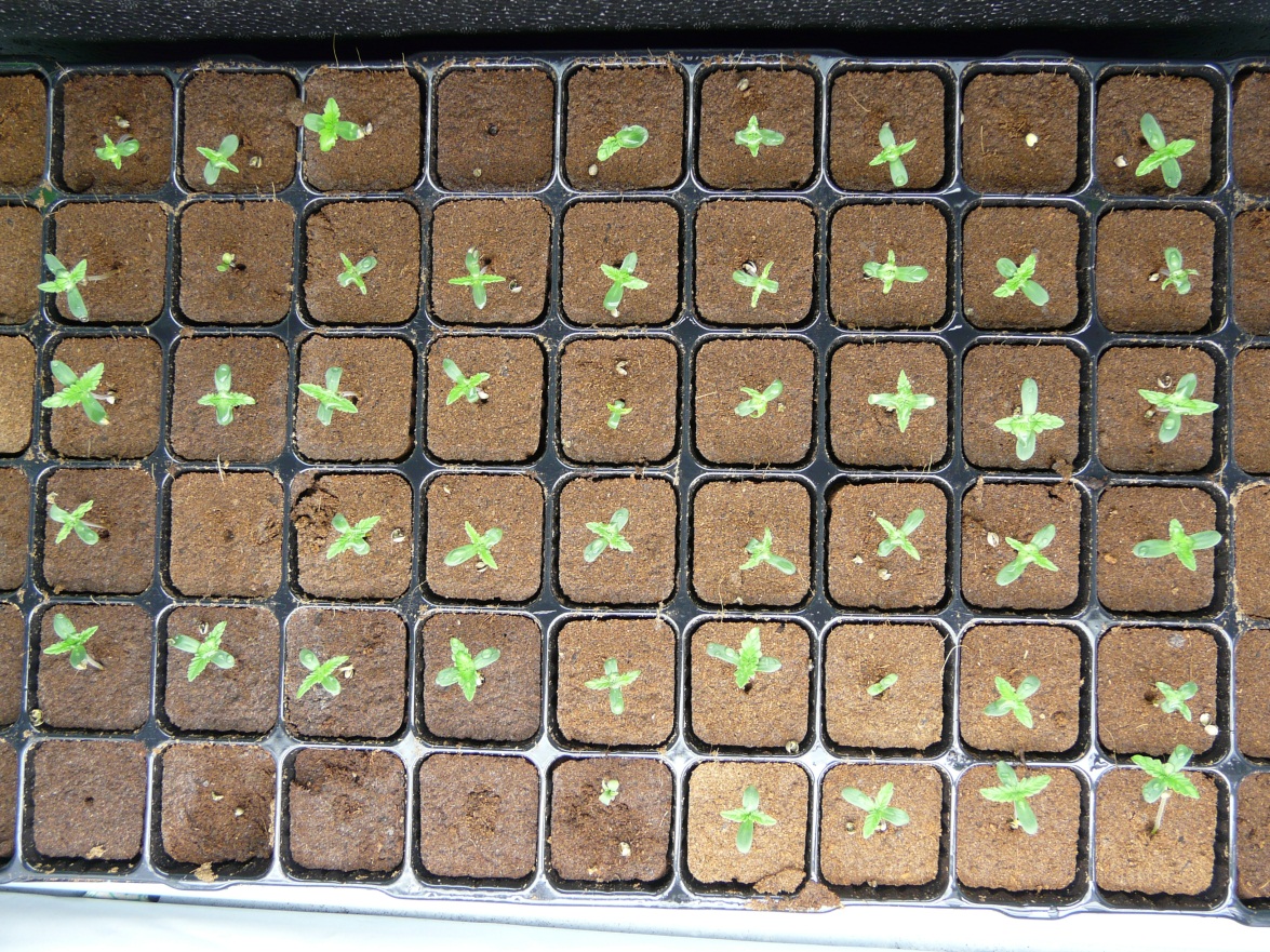 Dag 10, Ze staan nu precies 1 week na opkomst in de pluggen, ik ben zeer tevreden over het resultaat. Het is nu tijd om ze over te planten naar een medium. Er is nu ook enige voedingsbehoefte, en sommige blaadjes gaan elkaar overlappen. De pluggen zijn probleemloos uit de tray te halen, zonder beschadiging van het mooi ontwikkelde wortelstelsel. Iedere kweker zal hier blij van worden, zowel het ontkiem resultaat, als de week voorgroei zijn natuurlijk van groot belang voor de rest van de ontwikkeling van de plant.