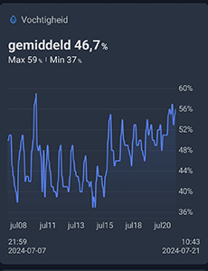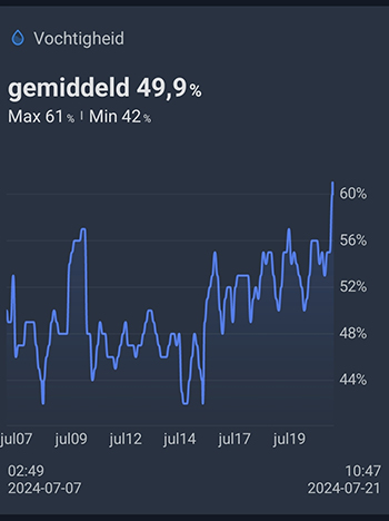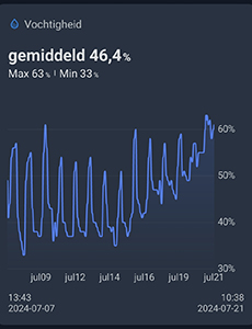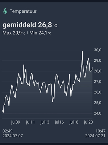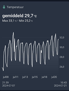 Ook in de kamer waar de kweekkasten staan heb ik sensoren hangen die de temperatuur voor me in de gaten houden. Hieronder zie je de grafieken van deze sensors.