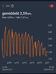 Het is namelijk maar 1,37 graden warmer, en de lucht is 3,97 procent vochtiger. Ik denk dat het grootste verschil komt wanneer de kweekkasten een tijdje op 12/12 draaien. Nu de grootste kweekkast is omgezet, lijkt het in de avonduren al een stuk koeler op de bovenverdieping. Hieronder zie je de grafieken van de temperatuur, luchtvochtigheid en VPD-waarde boven en onder in mijn grootste kweekkast, de G-Kit XL.
