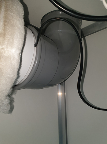 Ik ben toen even de schuur ingedoken voor een andere bocht om te kijken waar het probleem vandaan kwam. Na wat zoeken leek het probleem in de geluiddempende slang te zitten. Deze heb ik nog nooit vervangen en is dus al wat jaren oud, en heeft al wat motor- en filterwissels achter de rug. Als ik de slang bekijk zit hij vol met kleine scheurtjes, zowel aan de binnen- als buitenkant. Ik kreeg het gevoel dat de lucht daar lekte, en dus niet uit de kweekkast geblazen wordt.