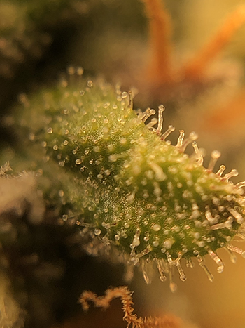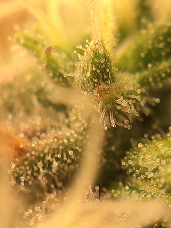 Ik heb dan ook besloten om de planten zo snel mogelijk om te halen om de schimmel geen kans te geven om verder te groeien. Afgelopen week heb ik nog wel wat leuke macro foto’s kunnen maken met een clip on macro lens voor op de telefoon, een heel handig dingetje om ook je trichomen mee te bekijken trouwens! Na het maken van een foto, kun je erop inzoomen om goed zicht te hebben op de trichomen.