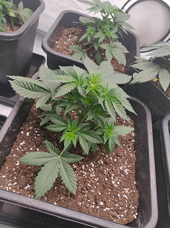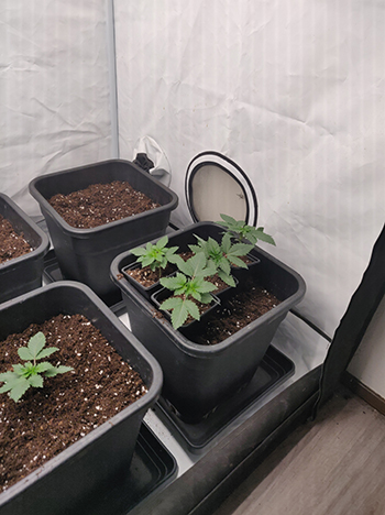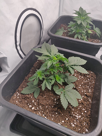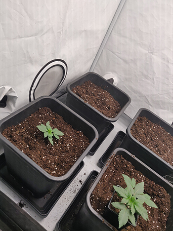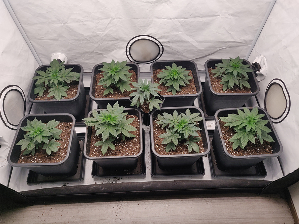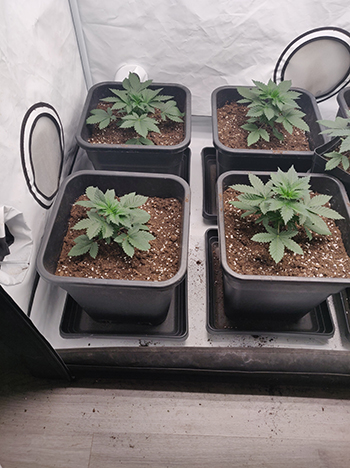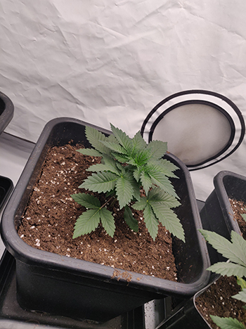 In de 18 liter potten zullen ze blijven tot ze afgebloeid zijn. Na het verpotten pasten de plantjes niet meer in ons kleine tentje, en hebben we ze naar onze grotere kweektent verplaatst. We hebben hiervoor gekozen voor een Phantom Deluxe met als lichtbron een G-Leds Target 330. Dit is een 300 Watt full-spectrum LED kweeklamp die ongeveer 40 cm boven de Snow Whites hangt. Voor de afzuiging gebruiken we een softbox met een Can-Lite 425 filter. Een Garden Highpro clip-on ventilator zorgt voor een beetje luchtverplaatsing in de ruimte.