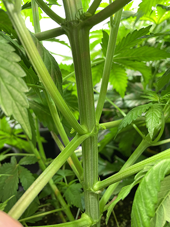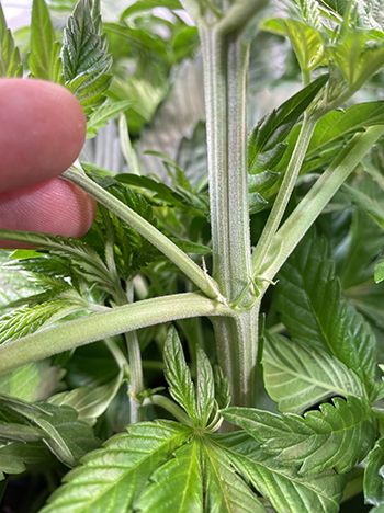 Het geslacht van een cannabis plant herken je aan de knopjes die uit de vertakkingen van de plant groeien. Ik kijk op de stam van de plant, op het punt waaruit een zijtak groeit. Dit noem je een node, terwijl de stam tussen twee nodes een internode genoemd wordt. Ik noem het zelf de oksels van de plant; op deze plekken begint de groei van de vrouwelijke, en bij mannen de mannelijke bloemen van de planten.