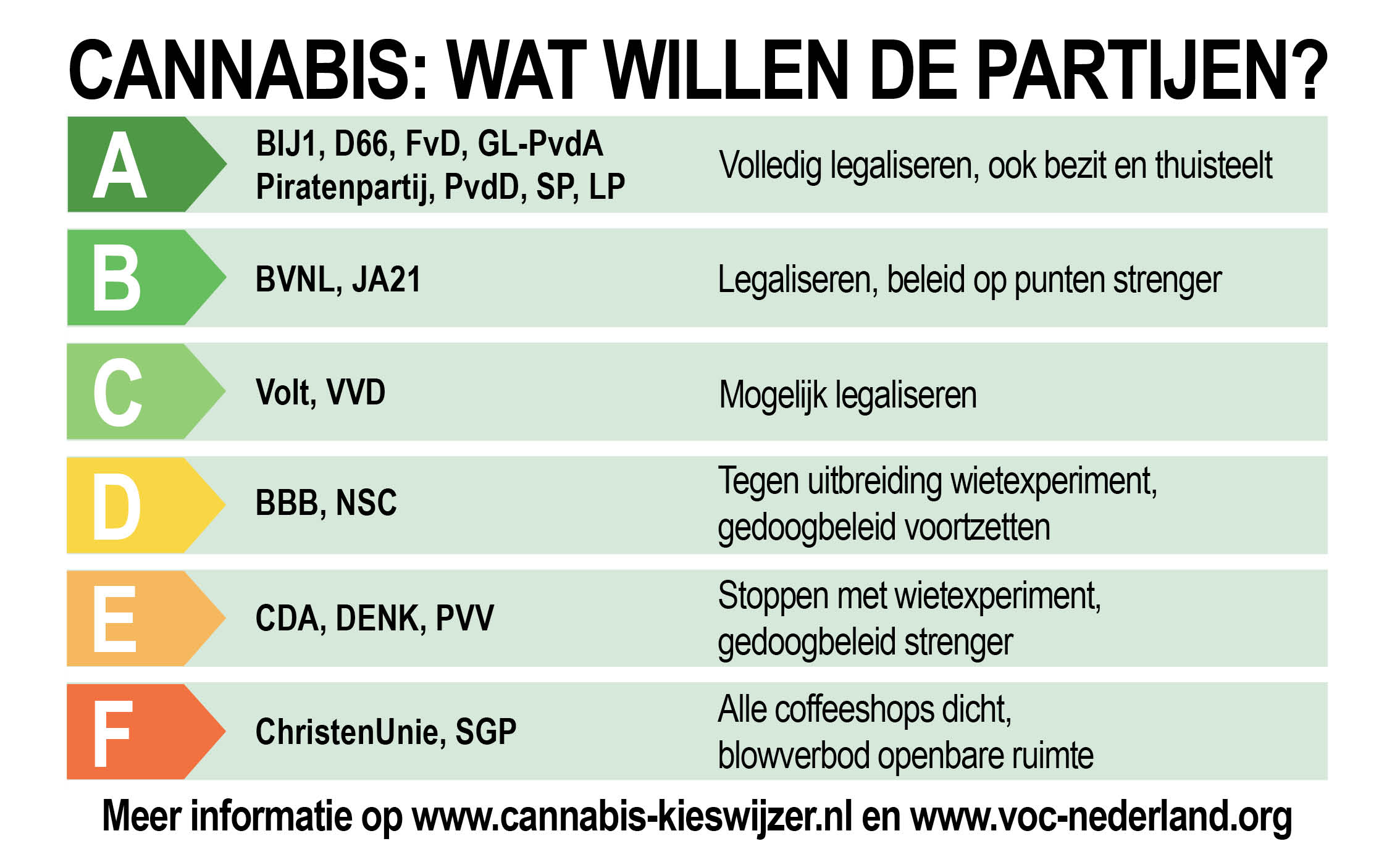 Het kan natuurlijk dat je dit allemaal te veel moeite vindt, maar dat je wel cannabisvriendelijk wil stemmen. In dat geval kun je het vakje rood kleuren van een landelijke partij die boven in het energie-label van de vorige landelijke verkiezingen stond: BIJ1, D66, FvD, GL-PvdA, Piratenpartij, PvdD, SP, LP, BVNL of JA21.