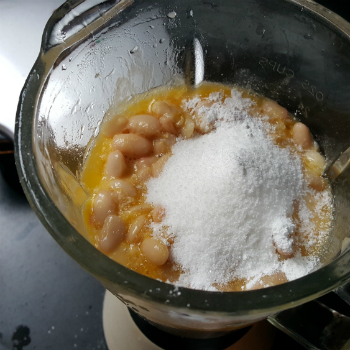 Je begint met het wassen van de witte bonen. Er zit in de potten witte bonen een soort smurrie op en die moet je er goed afwassen en de bonen daarna even goed laten uitlekken. Daarna gaan ze in de blender, samen met de eieren, de roomboter, de zakjes vanillesuiker en bakpoeder en de gedroogde wiet. Blend het geheel zo fijn mogelijk zodat de wiet bijna niet meer als wiet te herkennen is.