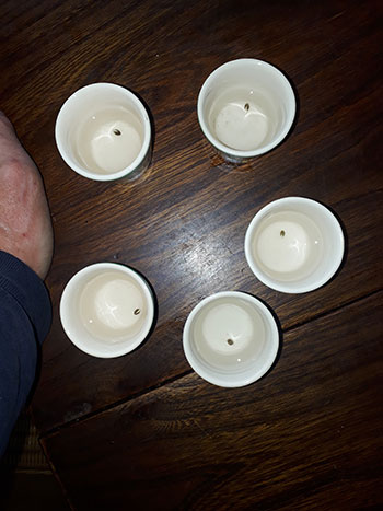 Bij Hans zijn de CNNBS Indica’s een weekje verder. Op de foto zie je ze (samen met een aantal andere zaailingen) op de 15e dag van hun leven, in gezellige rode drinkbekers met lightmix. Indica 2 kwam iets later en langzamer op dan de rest, nummer 1, 3 en 4 zien er mooi uit maar helaas is nummer 5 niet uitgekomen. De luchtvochtigheid is 50% en de temperatuur zo’n 25 graden, laat Hans weten.