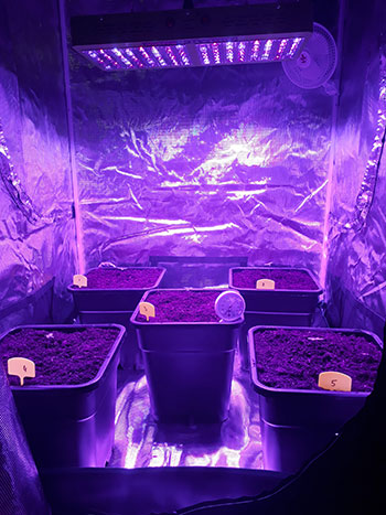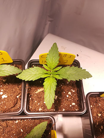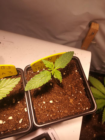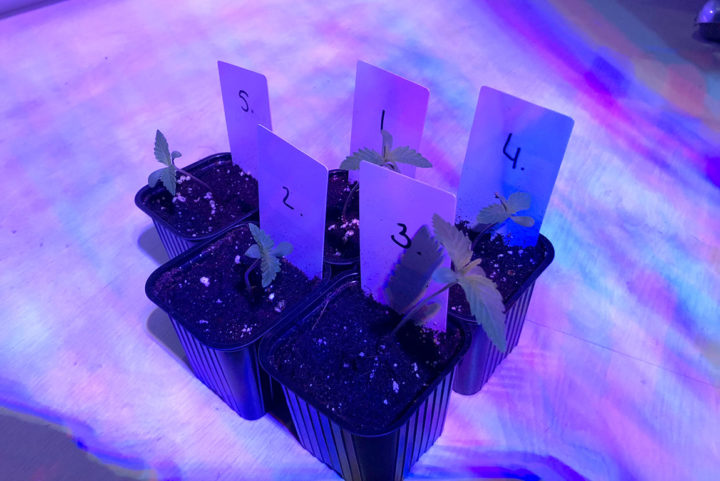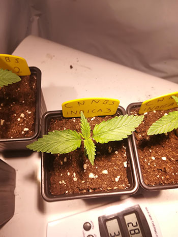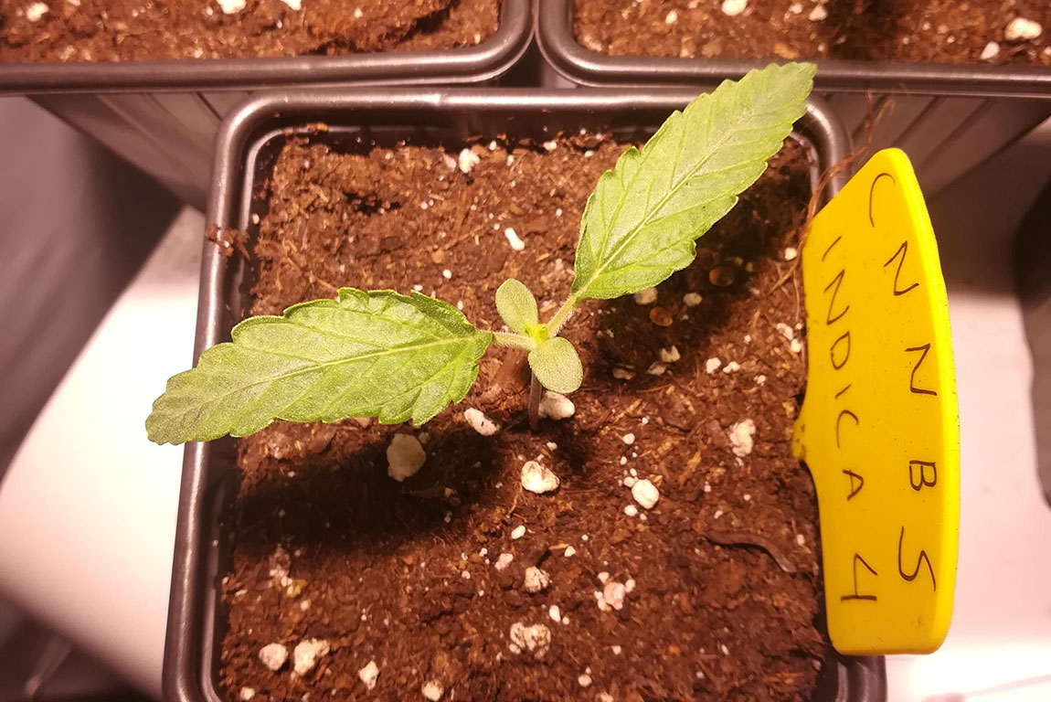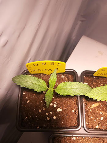 Ook bij Amon kwamen alle vijf de CNNBS Indica’s binnen twee dagen uit en gingen ze in turfbakjes om voor te groeien. Inmiddels zijn ze een week verder en staan de zaailingen in grote potten van 22 liter, onder het licht van een Mars Hydro Reflector 96.
