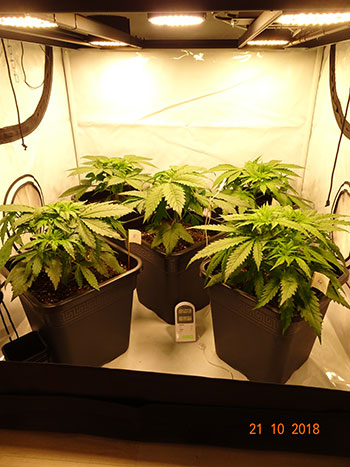 Bij Joop zijn er nagenoeg geen verschillen tussen de vijf indica’s op te merken. Ze zijn op de foto 12 dagen oud en staan nog in plastic bekers. Over een paar dagen worden ze overgepot en mogen ze onder de zelfbouw led met vier COB leds van Cree. Ze gaan een organisch leven tegemoet op aarde met mycorrhiza schimmels en buffertabletten in 8 liter Smartpots. Alleen in de bloeifase worden ze bij gevoed, en wel met BAC Organic Bloom.