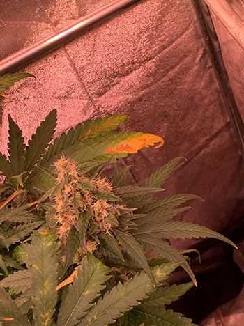 De kweektent van G. is goed gevuld en zijn White Choco Haze planten hebben ook al behoorlijk grote wiettoppen. Maar goed, dat is dan ook niet waarom hij de hulp van Lieve Muna inroept want dat zijn de bladeren. Deze beginnen te vergelen en dat begon na het gebruik van wat extra PK 13/14. Was dat misschien iets te veel van het goede?