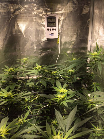 | Lieve Muna, Mijn Royal Medic is sinds deze een paar weken in bloei staat, geel aan het worden. Ik heb deze van buiten wel naar binnen geplaatst en wat gesnoeid aan de onderzijde. De plant staat in een 20-literpot, met All-mix grond. Ik geef sinds de bloei begonnen is ook Plagron Bloom volgens de voorschriften. De pH-waarde is rond de 6, de EC-waarde rond de 1,5. Ik probeer het klimaat in de tent (70x70x170) op peil te houden, dat lukt redelijk goed alhoewel de luchtvochtigheid de laatste dagen wel flink oploopt. Ik heb nu 2 kleine ventilators en een buisventilator geplaatst, nu zit de LV zo rond de 50 a 55%. De verlichting is 200 Watt, COB LED (2x Cree 3070). Deze hangt bijna tegen het dak van de tent, de temperatuur loopt nooit op tot boven de 27°.