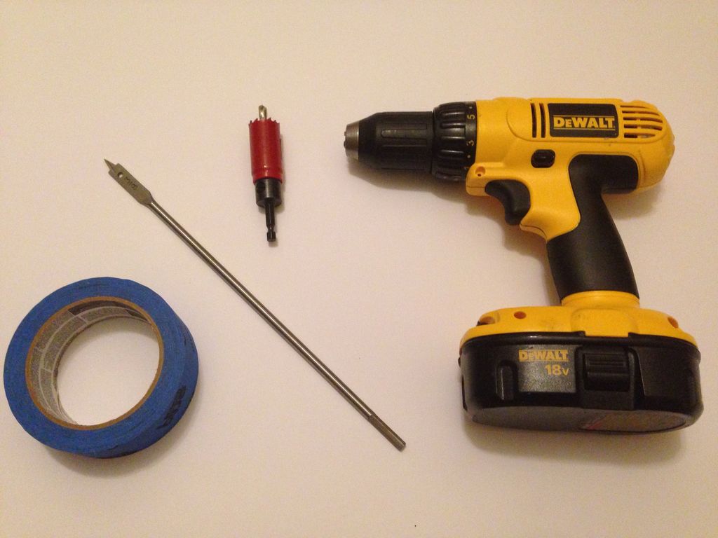 Bepaal nu waar je de bowl en de downstem wil hebben, door de downstem naast de bambong te houden kun je goed inschatten waar het gat zou moeten komen. Plak er een stuk tape op en boor met een speedboor een gat dat net iets groter is dan je downstem. Het kan makkelijk zijn om eerst een heel klein gaatje te boren zodat je een plek hebt om de punt van je speedboor in te laten draaien. Zorg ervoor dat je het gat onder een schuine hoek naar beneden boort. De downstem komt er immers ook schuin naar beneden gericht in straks.