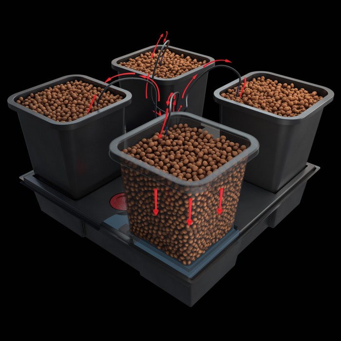 Het Wilma systeem van Atami biedt je een mooie kant en klare oplossing als je eens druppelsysteem wil proberen. Deze systemen bevatten een x aantal plantenpotten boven op een reservoir met voedingswater. Een aquariumpompje druppelt de voedingsoplossing in de plantenpotten waarna het overschot aan water aan de onderkant van de pot weer terugstroomt naar de voedingsoplossing. Simpel toch?