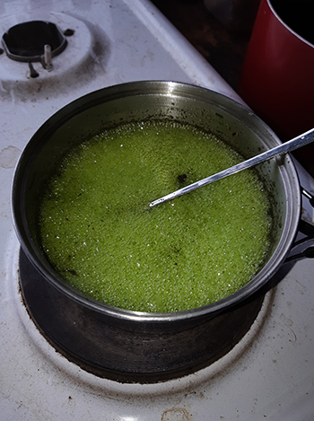 Zo gezegd zo gedaan; ik had twee potten met bladeren. Eén met de restanten van de grote bladeren, en één met het fijne knipwerk (suikerblaadjes, red.). Deze laatste is een mindere hoeveelheid had maar die zou wel sterker moeten zijn door de grotere hoeveelheid kristallen. Ik ben begonnen met de pot met grotere bladeren om er weer in te komen. Het ging vrij goed en heb er uiteindelijk een klein potje olie mee kunnen vullen.