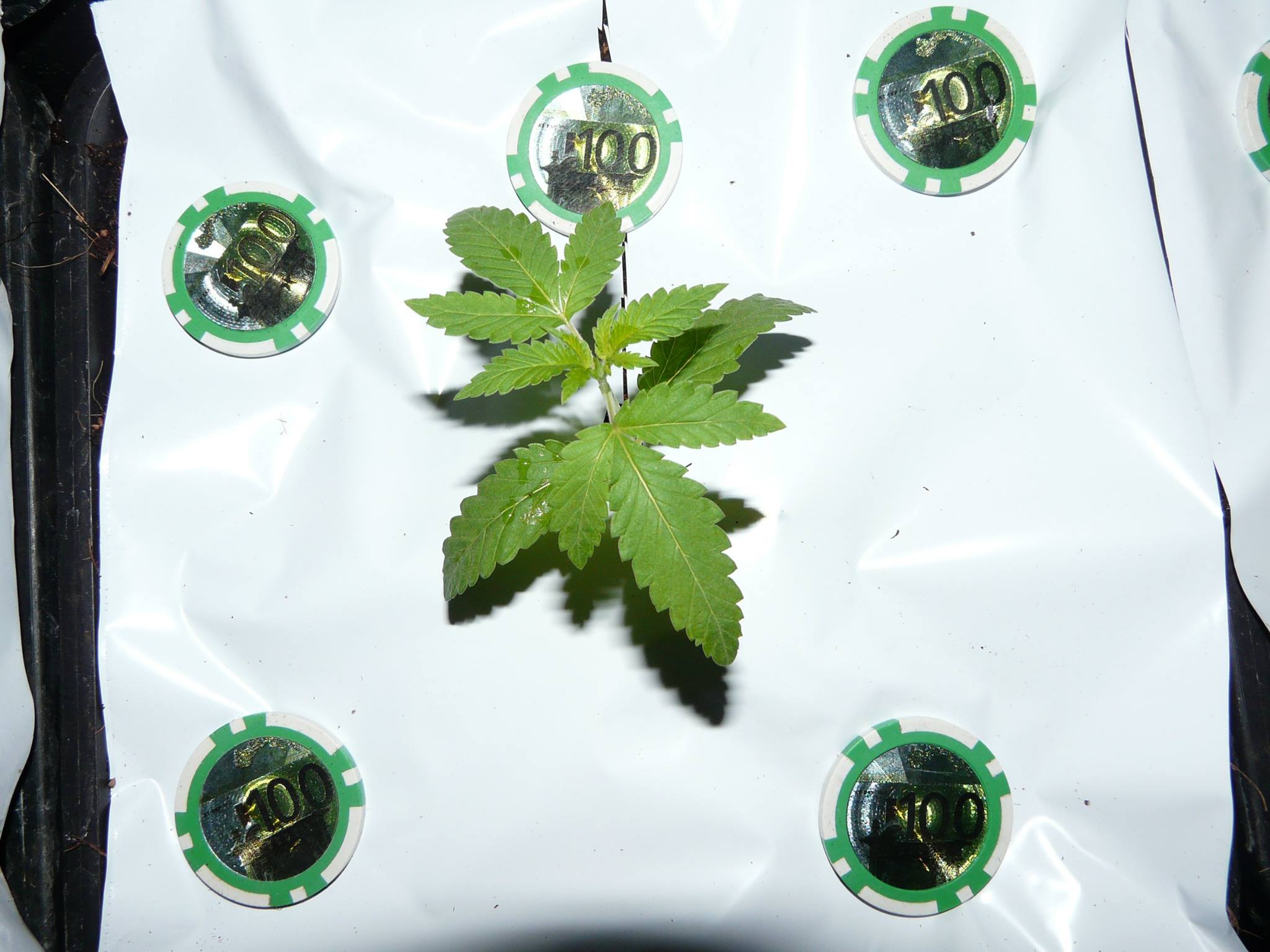 Na 60 uur zijn nagenoeg alle zaden uitgekomen en kan het licht aan. Ik zet ze dus onder een T-Neon groeilamp die in het begin 24 uur aanstaat, maar waarvan ik het aantal lichturen meteen af begin te bouwen. Dagelijks een uurtje minder tot ze na een week in de pluggen echt perfect doorworteld zijn, op 18 uur licht staan, en over kunnen naar hun 11-literpotten in de bloeiruimte onder de Gavita Pro lamp.