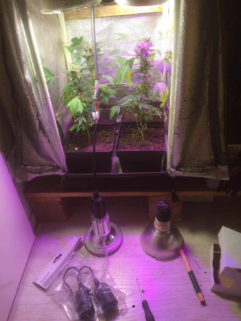 De spaarlampjes zijn al zo’n 7 jaar oud nu, en hebben hun beste tijd wel gehad dacht ik zo. Bovendien is er zojuist ook een van gebroken. Tijd voor een upgrade dus in het minihokje. Via via (Pino, Tommie etc.) kon ik goedkoop aan een paar industriële LED-kweeklampjes voor de tuinbouw komen. Vier witte lampjes voor de groei- en vier paarse lampjes voor de bloeifase. De lampen zijn 18 Watt en de spaarlampen waren 23 Watt, en daarmee bespaar ik in totaal dus 4 keer 5 = 20 Watt, maar daar is het me niet om te doen. Ik hoop natuurlijk vooral dat deze LED’s tot betere resultaten zullen leiden.