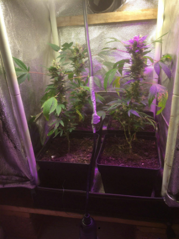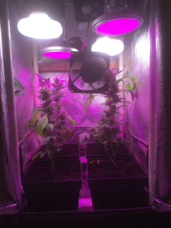 Toen heb ik de verbindingen goed ingetaped, de fittingen opgehangen en kon het LED zonnetje gaan schijnen. Ik ben benieuwd hoe de plantjes dat de komende drie weken gaan vinden. Zo lang duurt het namelijk ongeveer nog voor de dames klaar zullen zijn voor de oogst.