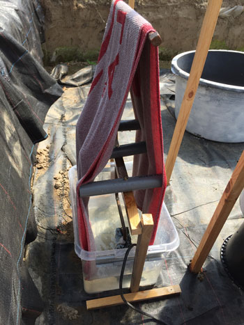20 mei, de luchtvochtigheid is wat te laag overdag nu de planten nog in de groeifase zitten. Ik heb een handdoek die nat wordt gehouden door een vijverpomp in de serre geplaatst. Het voelt al heel wat beter aan!