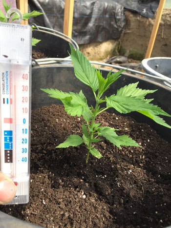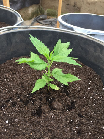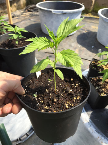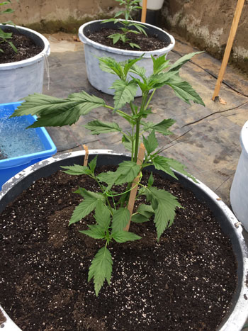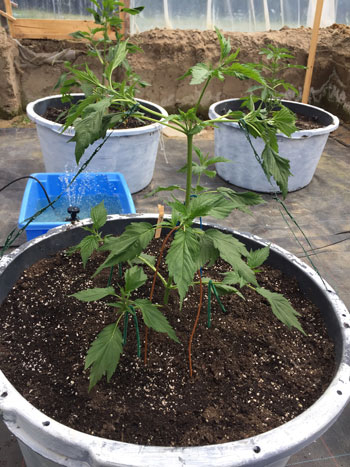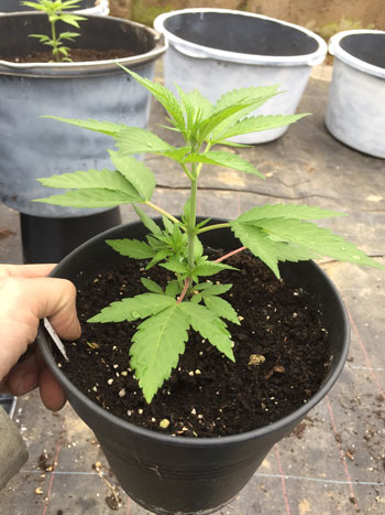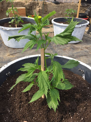 25 mei, verpotten naar 20-literpotten. De Frisian Duck heeft al acht vertakkingen (nodes) en groeit mooi en snel. Door de vergroeide bladvingers zien de planten eruit als doodgewone tuinplanten.